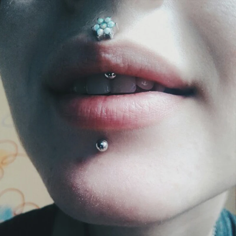 - «Антисмайл» и «Смайл» – это проколы уздечки под нижней и верхней губой соответственно. Первый вариант виден только при открывании рта, а второй – во время улыбки. Не самый удобный способ – украшение мешает во время еды и портит зубы.