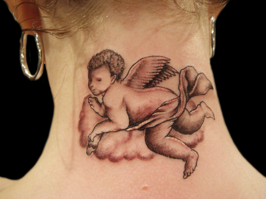38. Это могла быть фея или ангел, трудно сказать. Похоже, что крылья даже крылья бабочки. Это тонкая татуировка, которая наносится на основание шеи.