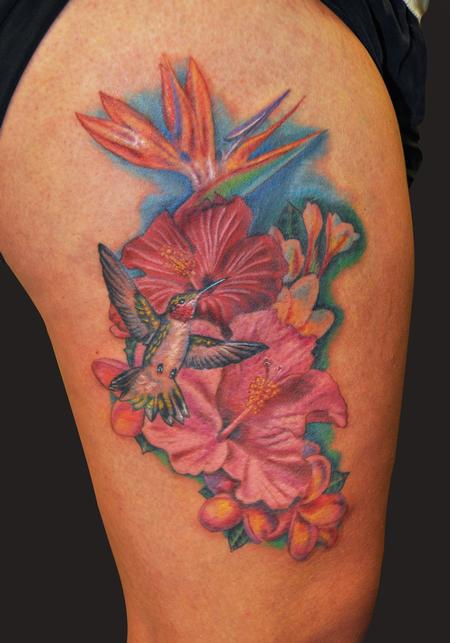 Бедро — отличное место для татуировки гибискуса, потому что этот регион представляет собой большой холст для работы художника.