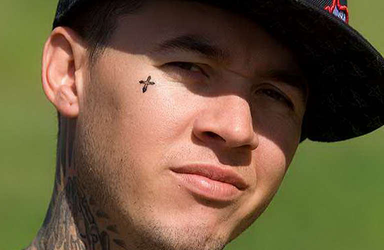 - Надписи. Короткие фразы вдоль скул или над бровями. Один из наиболее популярных видов татуировок на лице. Лицевые надписи идеально подходят любому, а для популярных реперов стали, похоже, обязательным атрибутом.